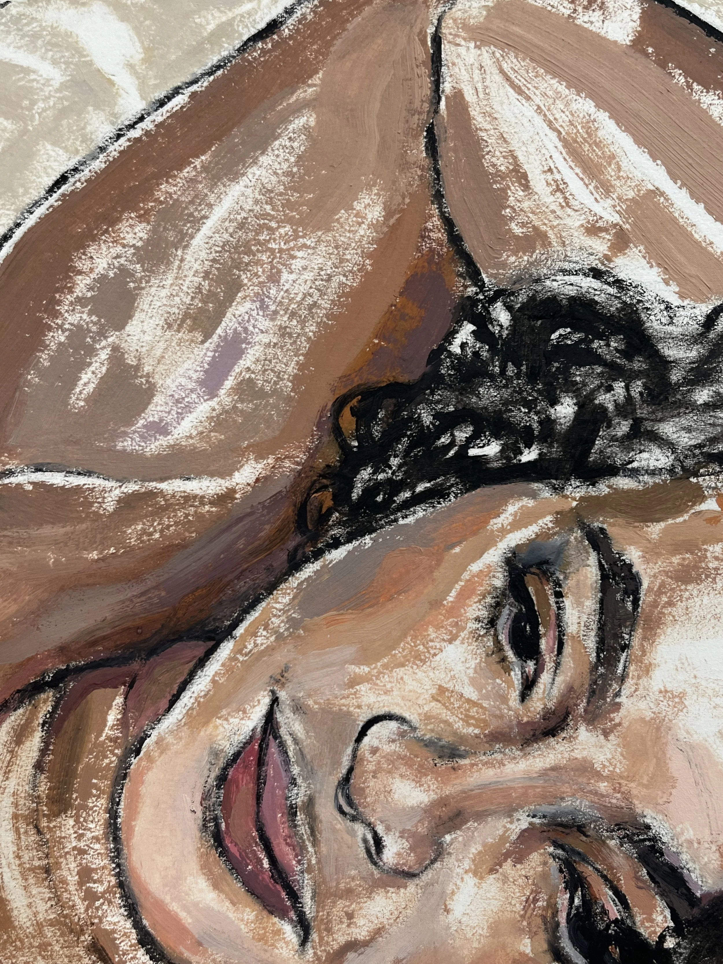 Eiderdown reimagines the classical reclining figure through a contemporary lens, portraying a woman completely at ease in her own presence. Wrapped in soft fabrics and muted tones, the painting invites a sense of calm and quiet strength. Blending tradition with a modern gaze, it becomes a gentle statement of self-possession and ease.