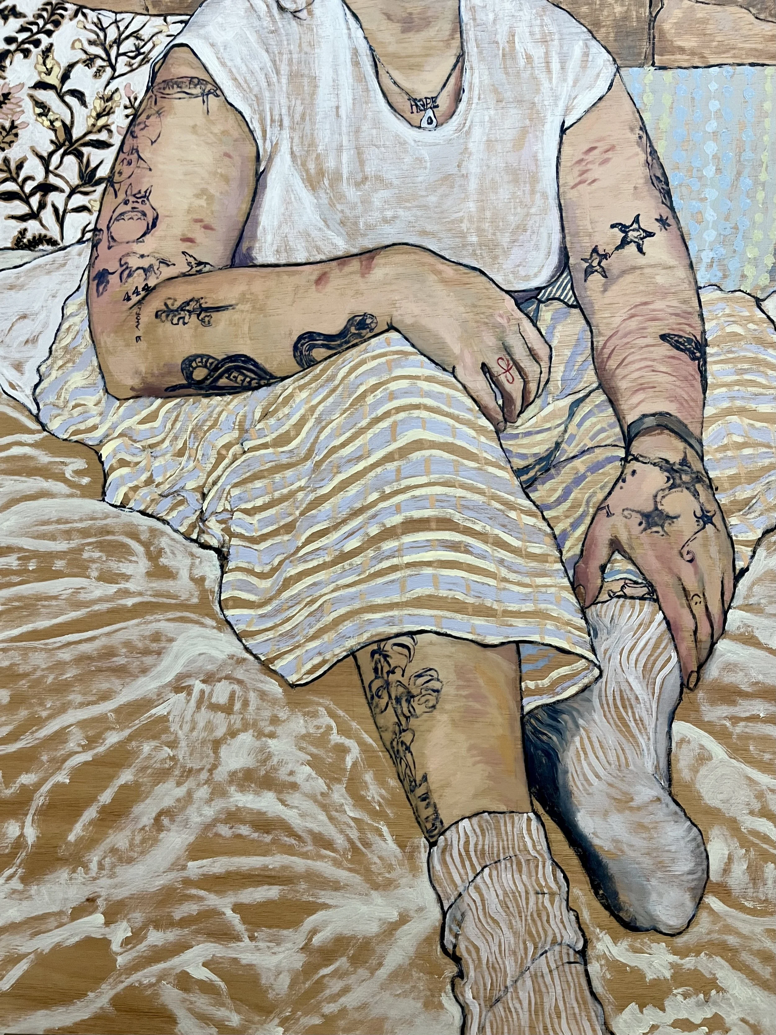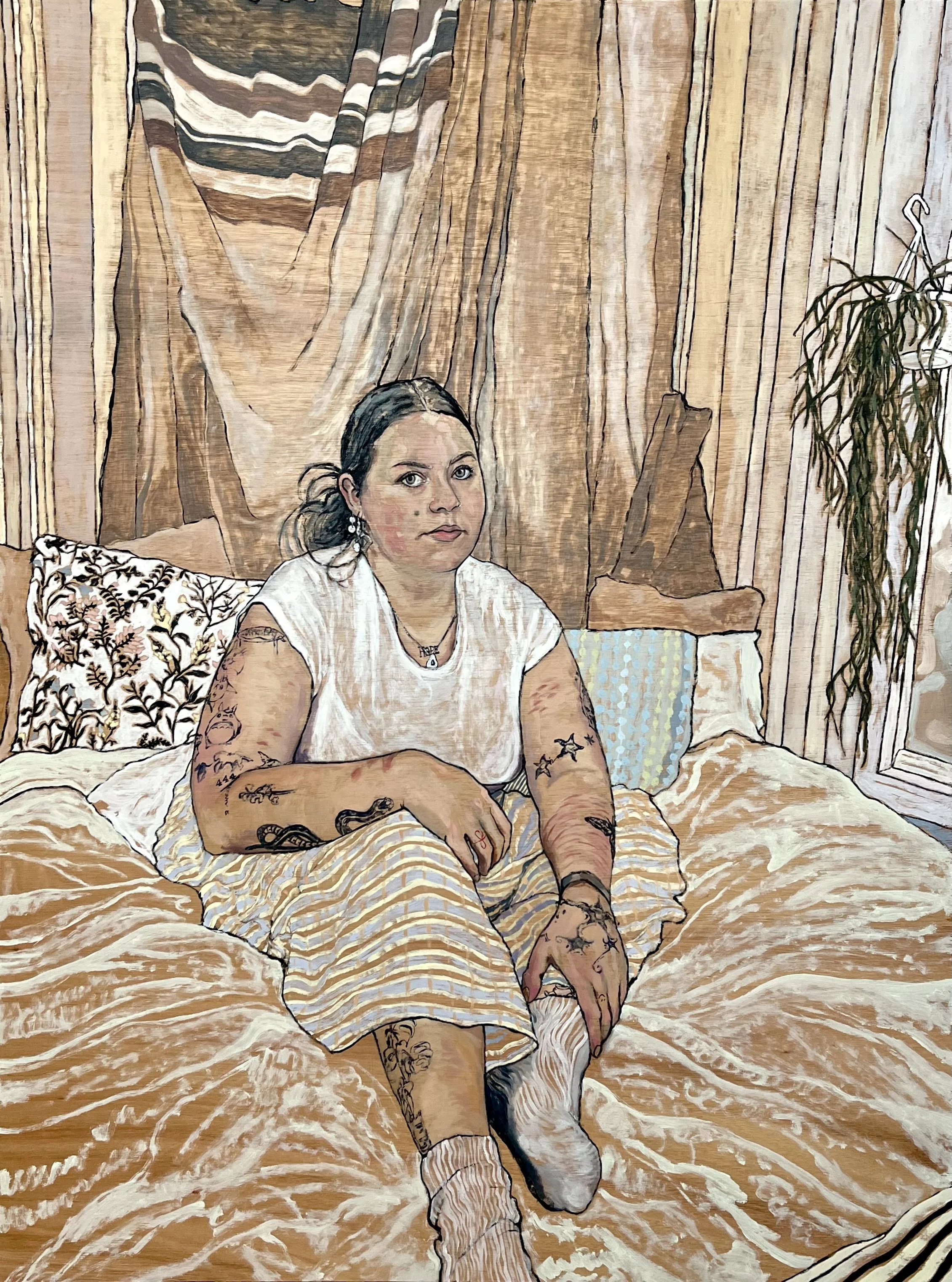 This portrait explores themes of resilience, self-expression, creativity and comfort. Through delicate layers of oil paint on wood, the work captures the essence of a creative spirit at rest, offering a glimpse into a world of vulnerability and authenticity. The visible grain of the wooden panel enhances the painting’s organic and ethereal quality. Celebrating individuality and inner strength, this is a calm, reflective piece that invites connection.