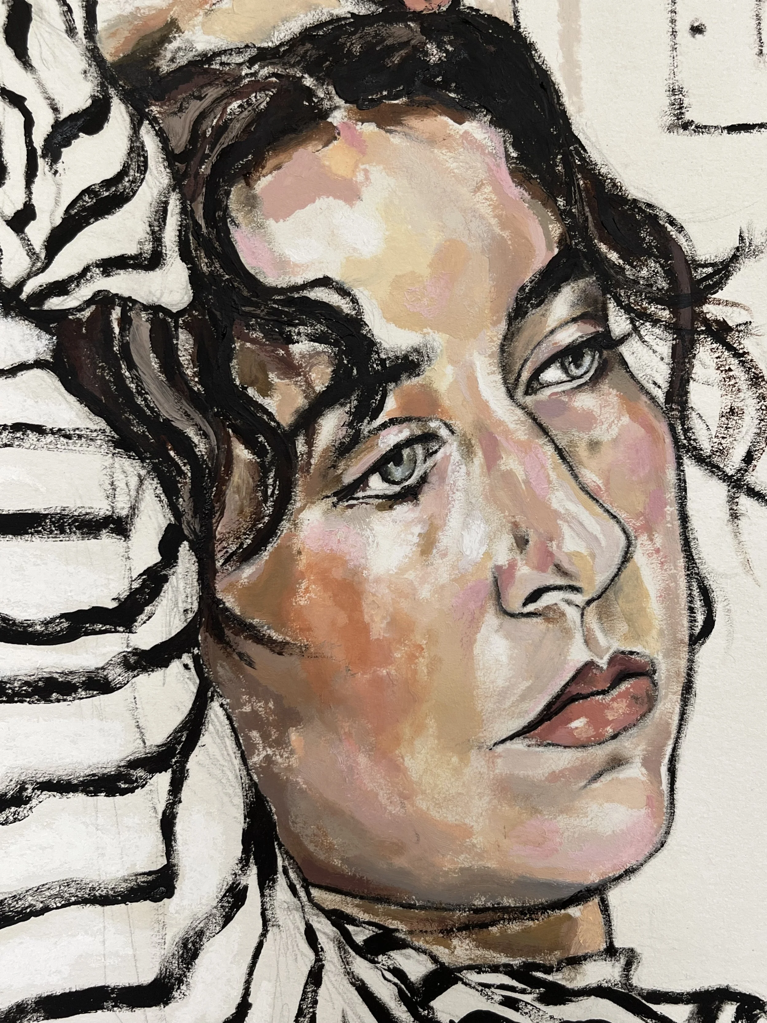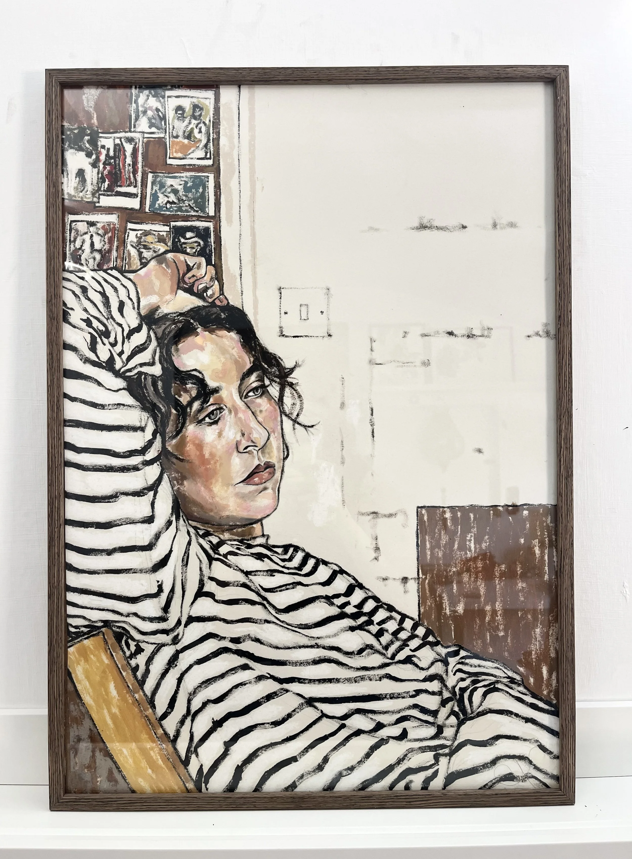 A self-portrait born from creative block and quiet frustration, Tosca captures the artist suspended in a moment of stillness, waiting and reflecting. With a blank canvas behind her, shadows of past work on the walls, and the silent gaze of art heroes above, the painting speaks to solitude, emotional fatigue, and the tension between inspiration and absence. Rooted in themes of longing and reflection, this piece invites you into the quiet, often unseen, corners of the creative process.
